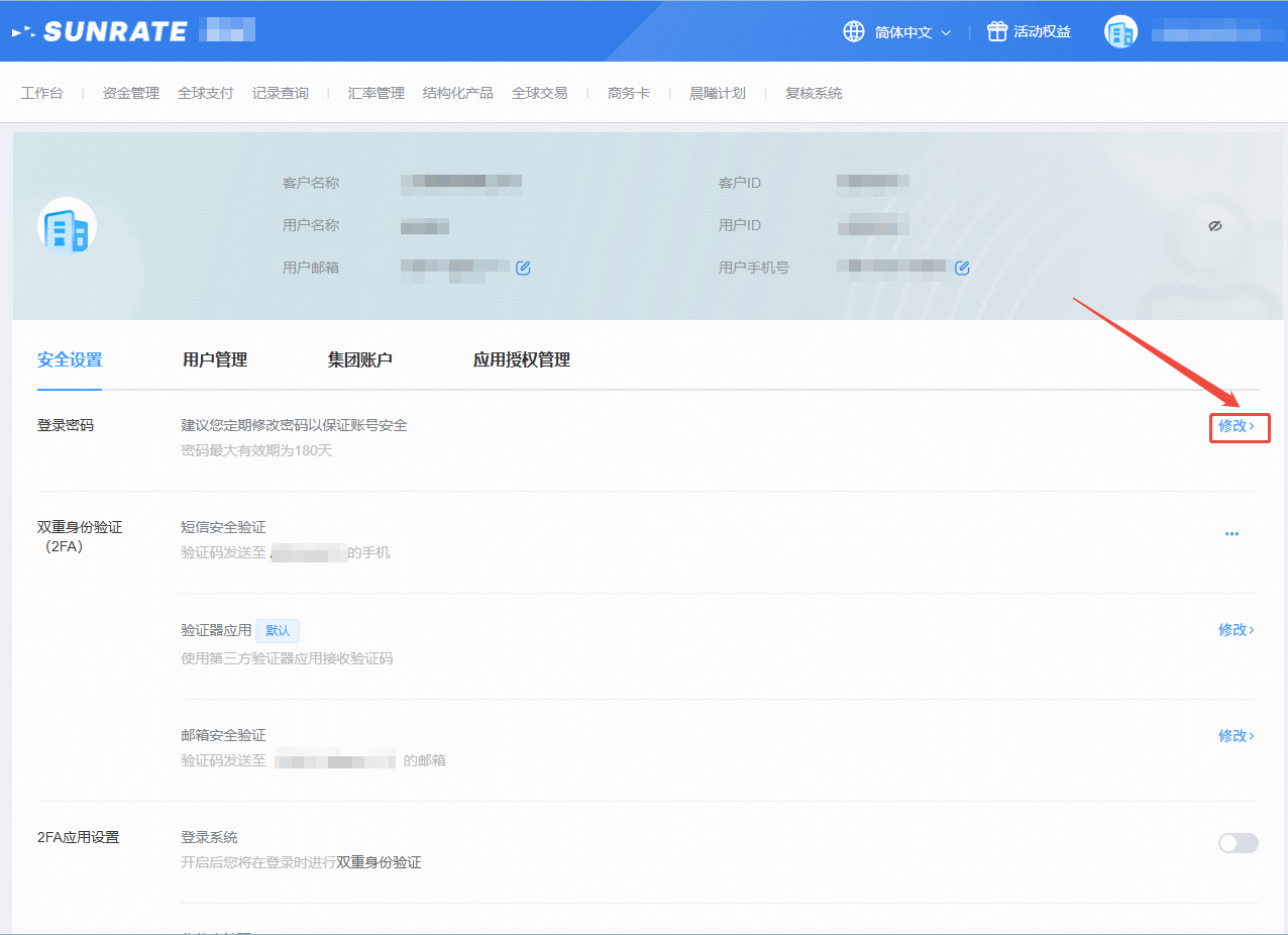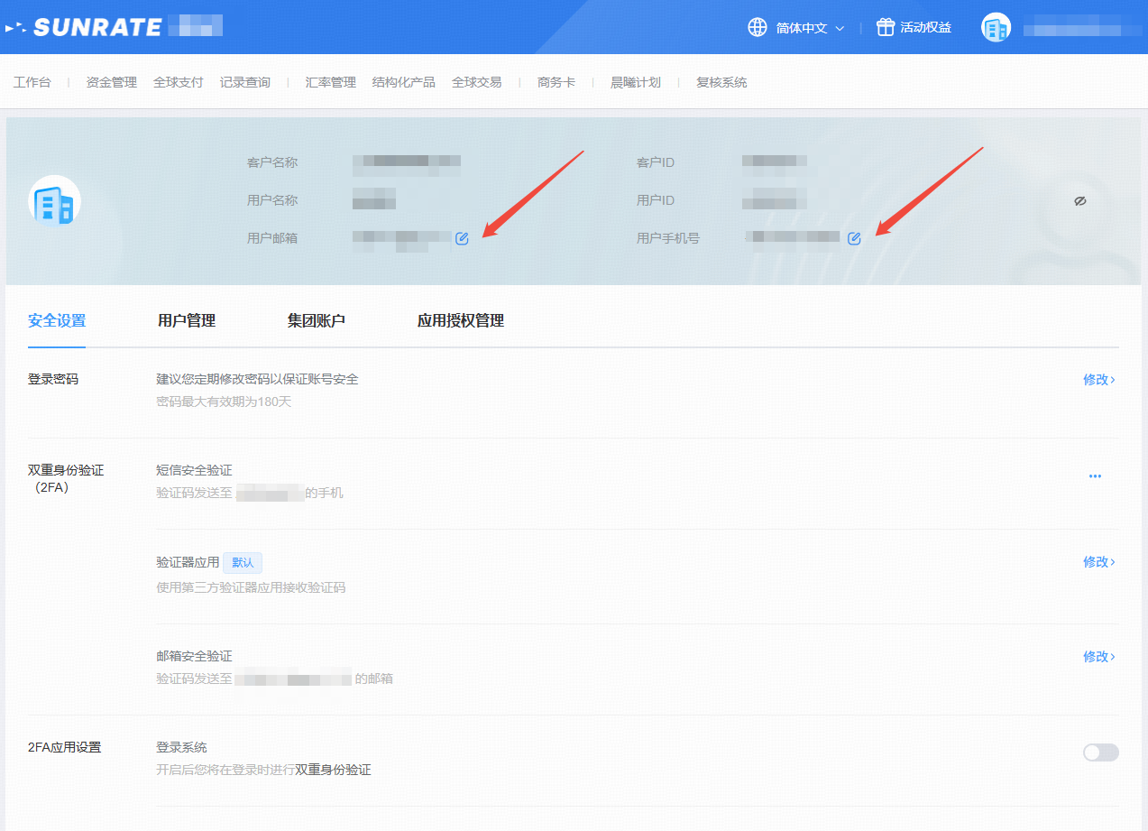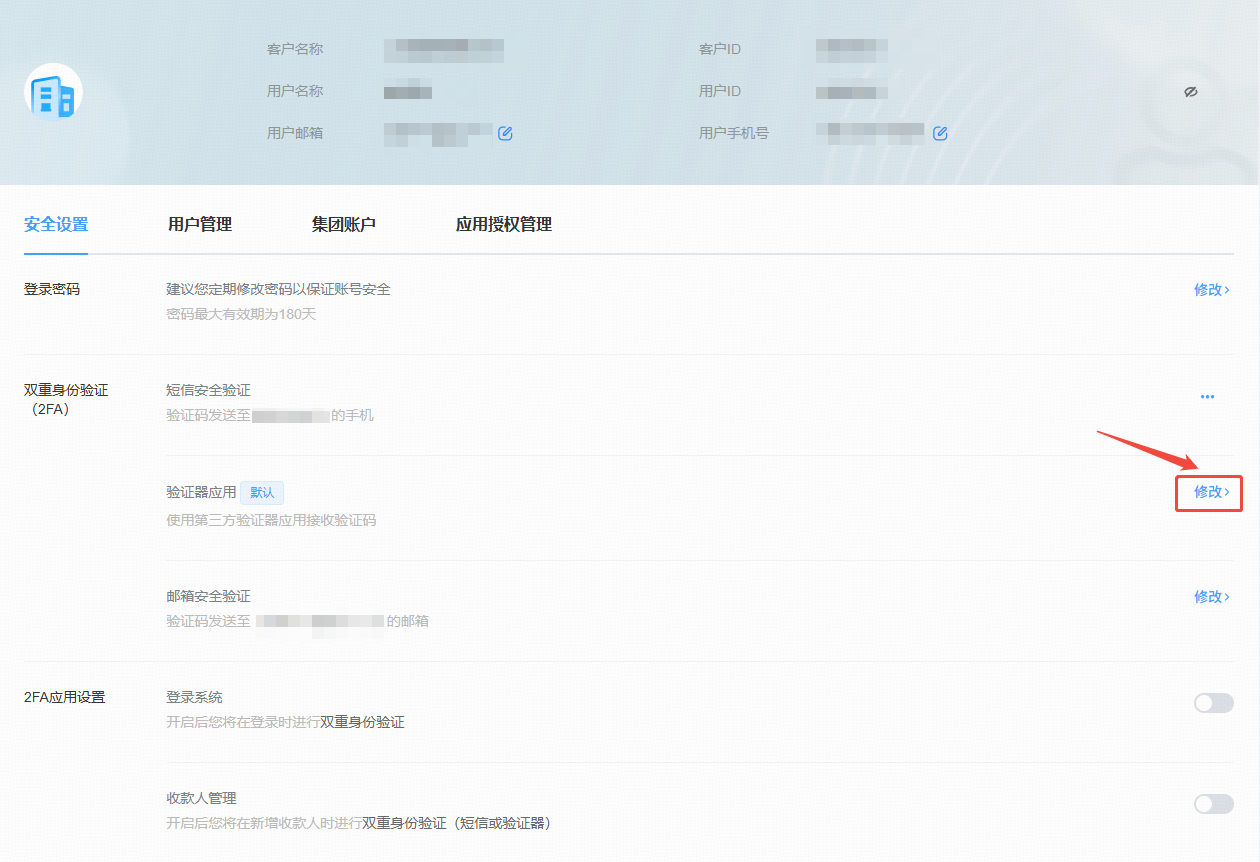 安全设置点击右上角您的账户,在下拉菜单中选择【账户中心】。修改注册邮箱和手机号如需修改注册邮箱或手机号,可点击对应信息末尾的修改按钮。修改登录密码如需修改登录密码,可点击最右侧的【修改】。确认新旧密码后,通过注册手机号或邮箱收取验证码,填写后点击【提交】。添加双重身份验证(2FA)首次添加验证器应用,请点击最右侧的【设置】。根据步骤提示添加验证器。