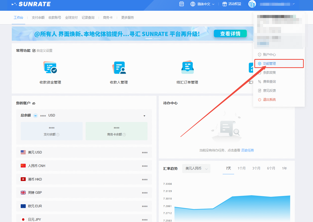 点击右上角您的账户,在下拉菜单中选择【功能管理】。