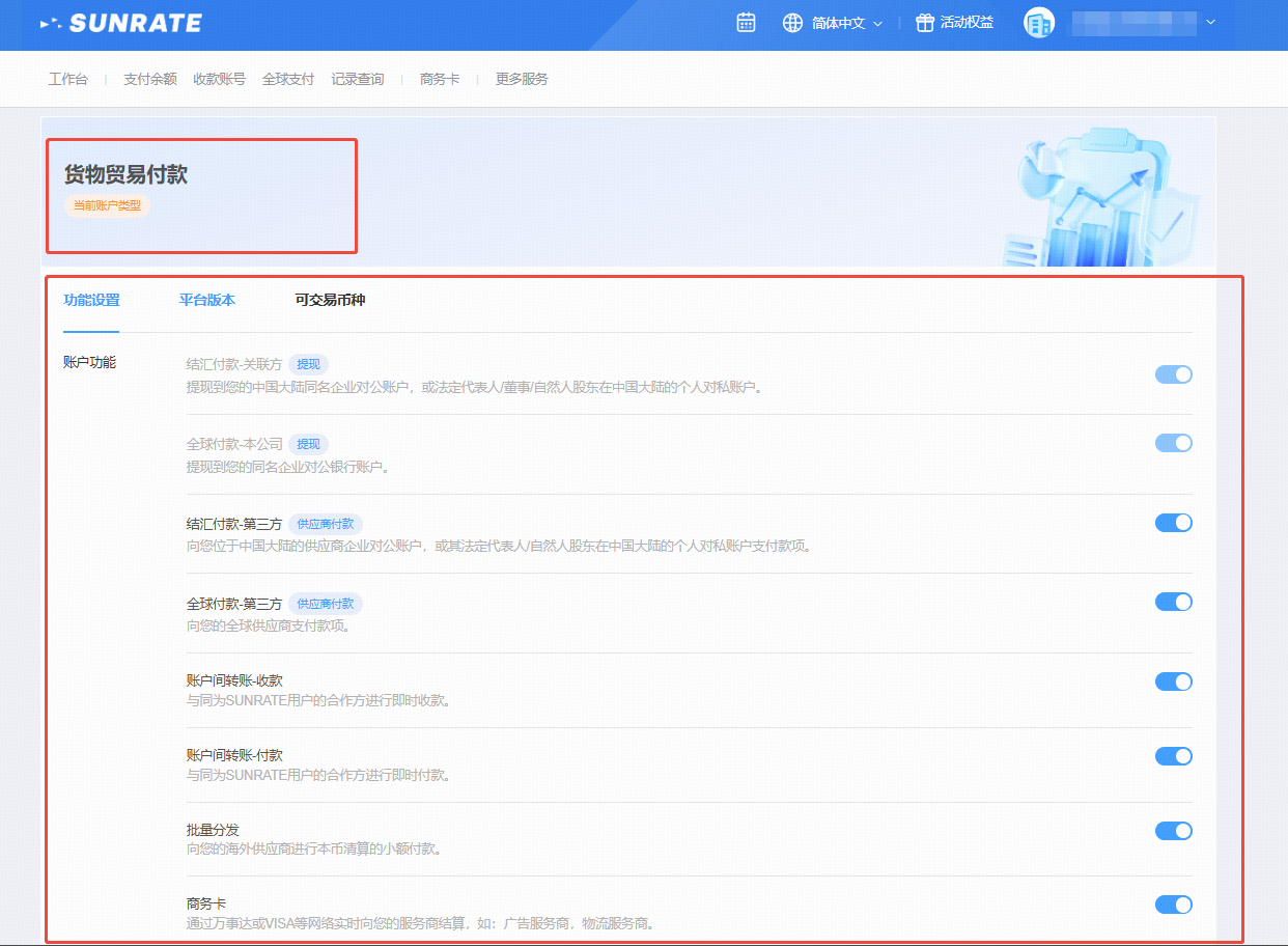 在功能设置页面,请检查您当前的账户类型和账户功能是否符合您的业务需求。如果将来对账户功能的需求发生变化,您可以随时手动修改。