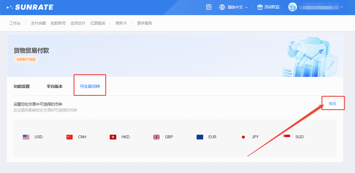 在【可交易币种】页面,您可以手动更改货币设置,以便最好地满足您的业务需求。