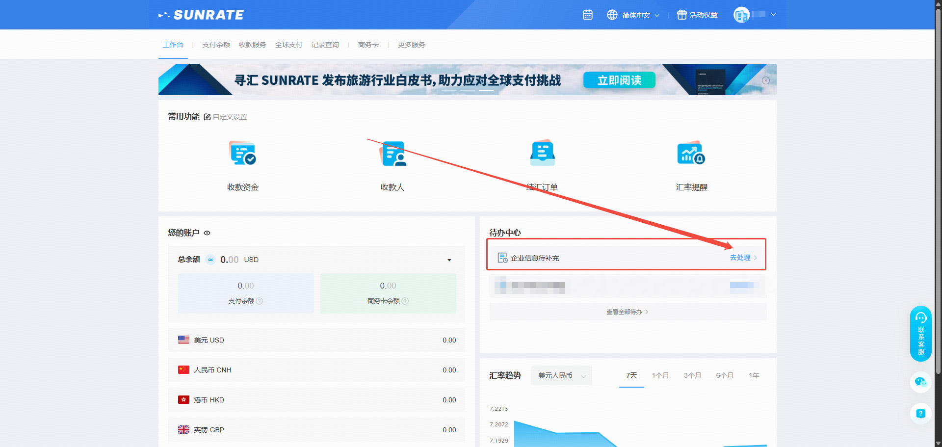 首次登录后,请查看屏幕右侧的待办事项列表。如果看到“企业信息待补充”的提醒,请点击【去处理】填写企业信息补充表,以确保收款/付款流程顺利进行。