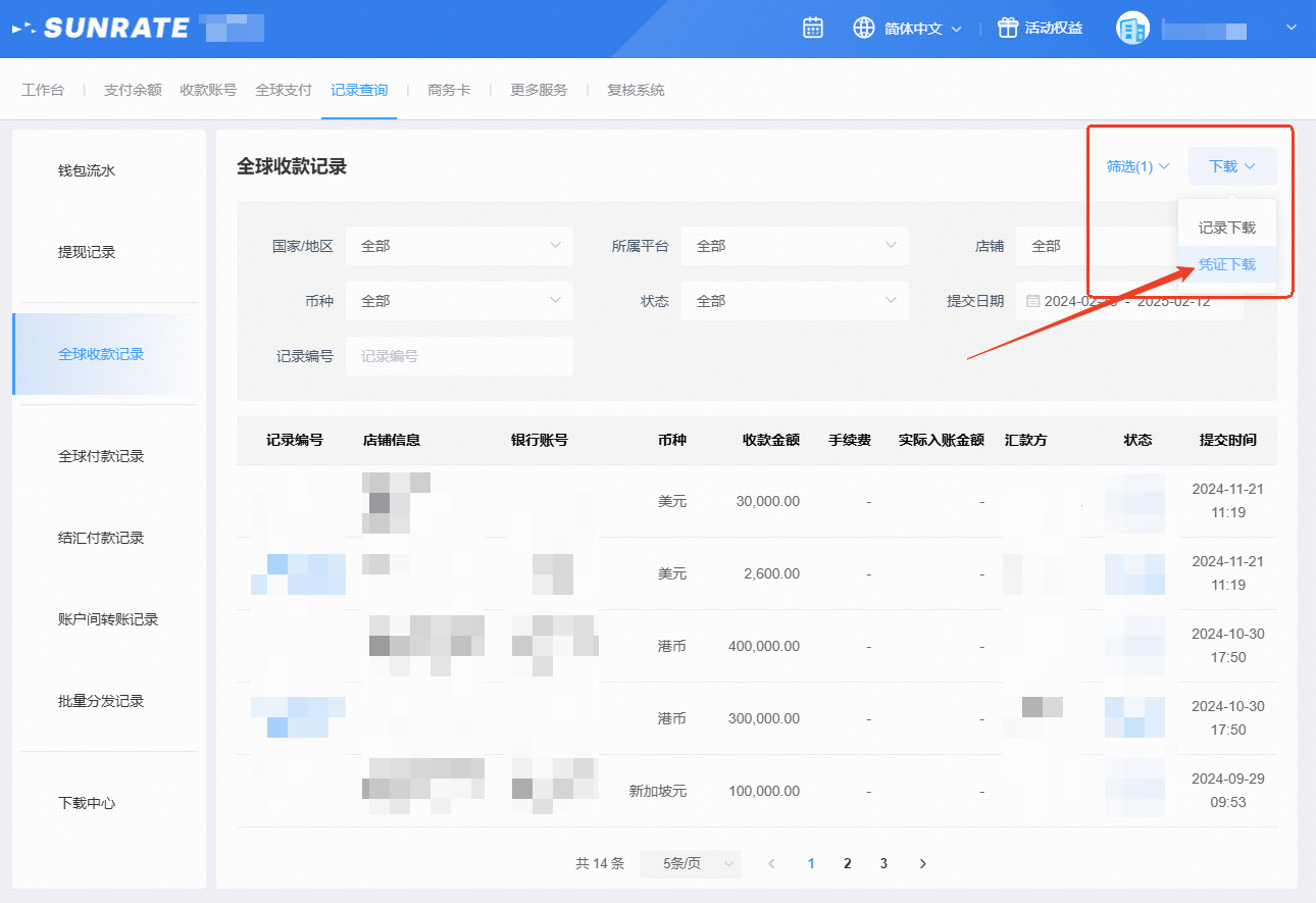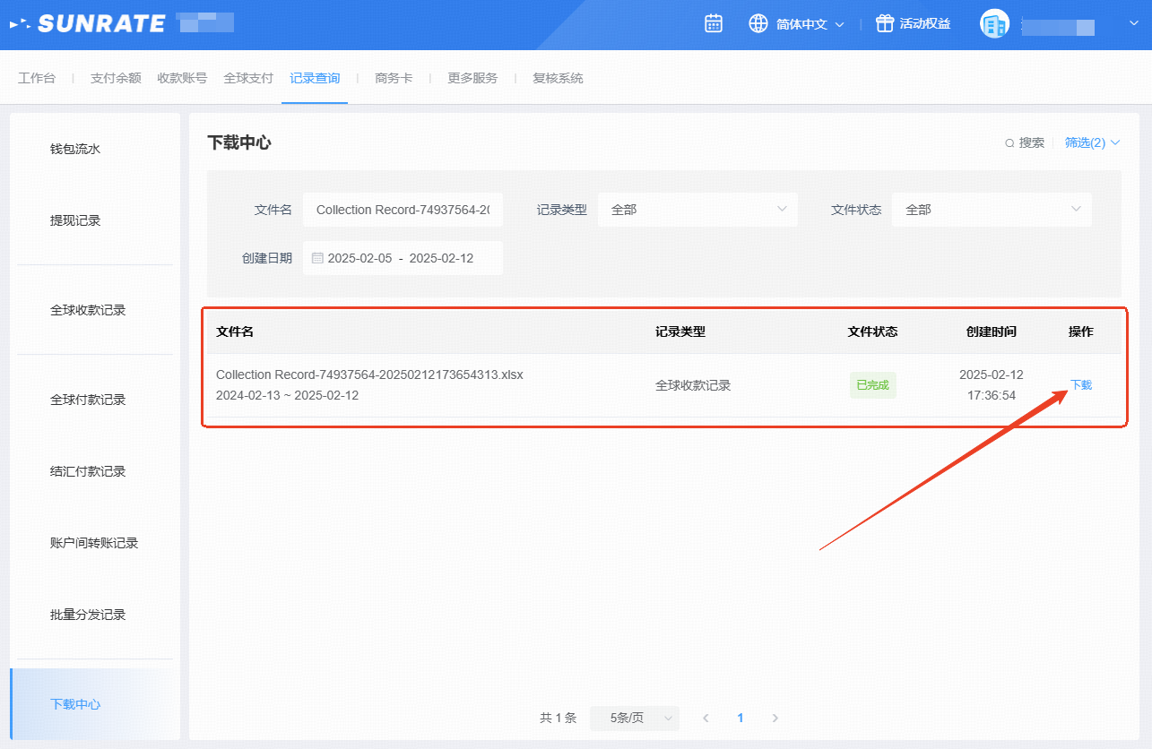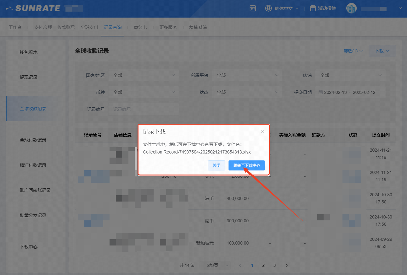 全球收款记录包含账号的所有收款交易情况以及流水记录查看全球收款记录点击【记录查询】—【全球收款记录】。下载全球收款记录凭证若需要下载全球收款记录凭证,点击右上角【下载】,在下拉菜单中选择【凭证下载】。在跳转页面上下载对应时间段的凭证。下载全球收款记录若需要下载全球收款记录,选择好对应的记录信息之后,点击右上角【下载】,在下拉菜单中选择【记录下载】。点击【确认下载】。点击【跳转至下载中心】。在下载中心下载该记录。