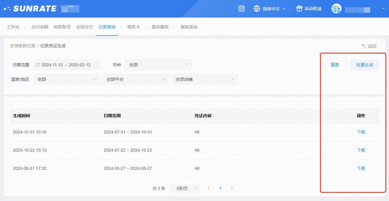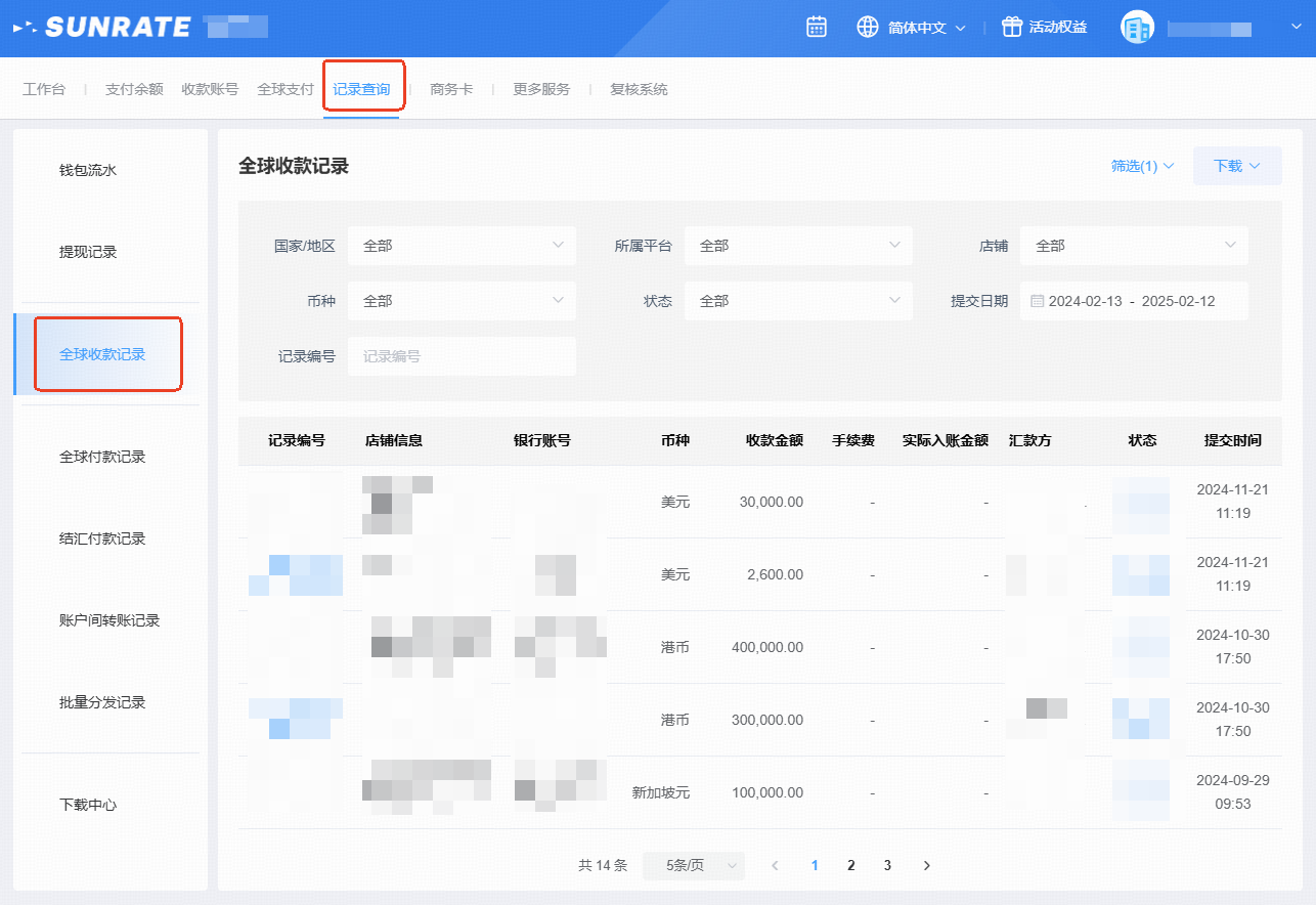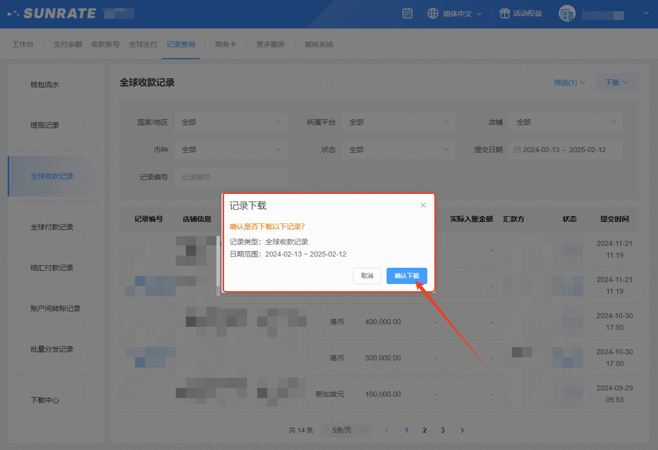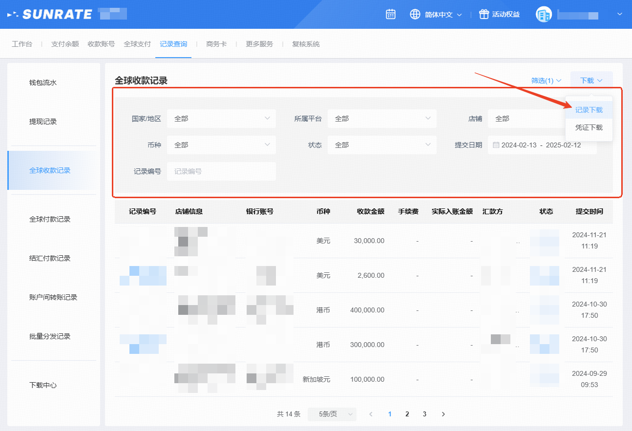 全球收款记录包含账号的所有收款交易情况以及流水记录查看全球收款记录点击【记录查询】—【全球收款记录】。下载全球收款记录凭证若需要下载全球收款记录凭证,点击右上角【下载】,在下拉菜单中选择【凭证下载】。在跳转页面上下载对应时间段的凭证。下载全球收款记录若需要下载全球收款记录,选择好对应的记录信息之后,点击右上角【下载】,在下拉菜单中选择【记录下载】。点击【确认下载】。点击【跳转至下载中心】。在下载中心下载该记录。