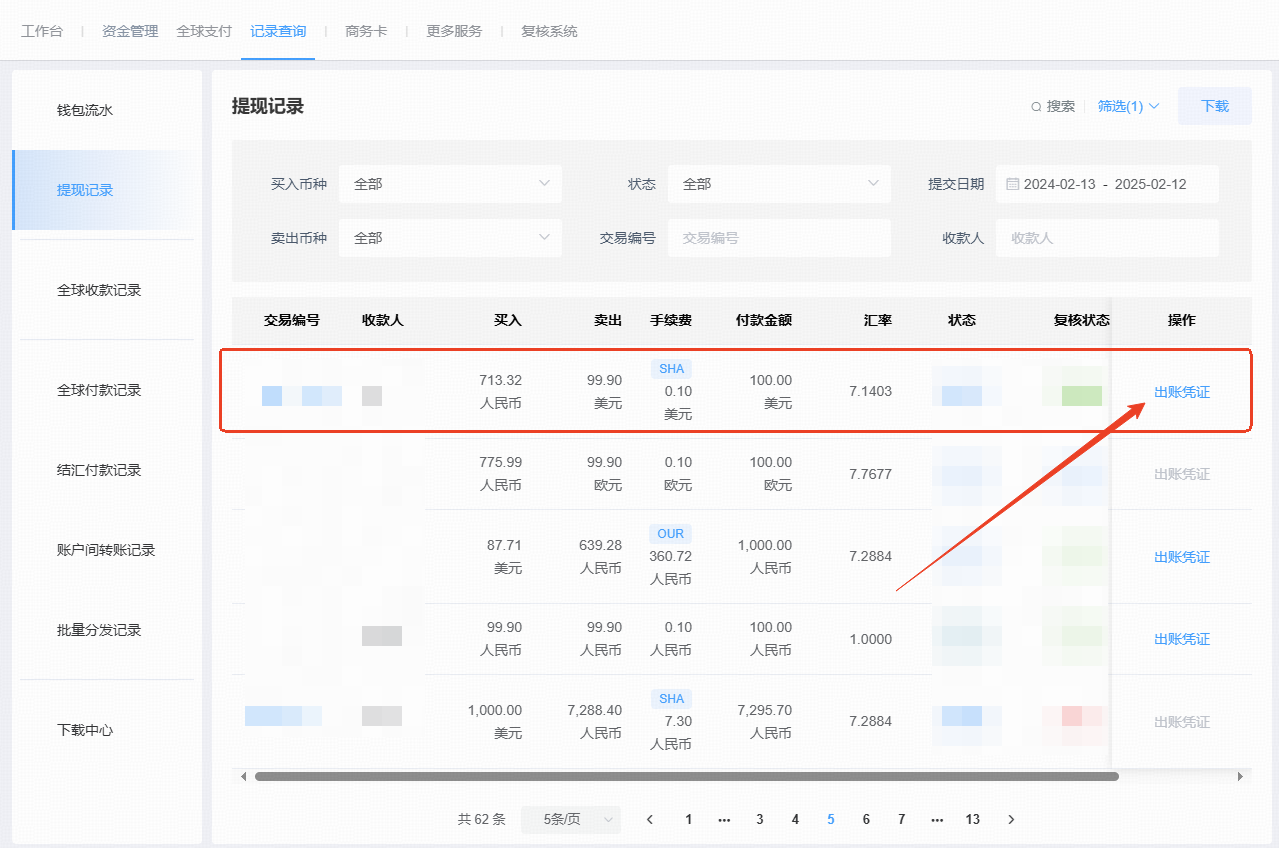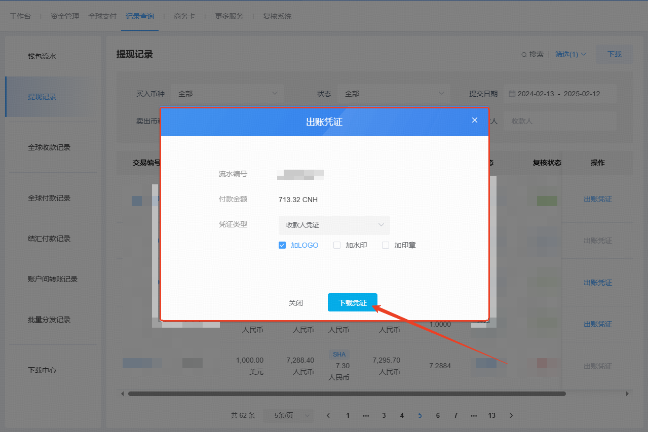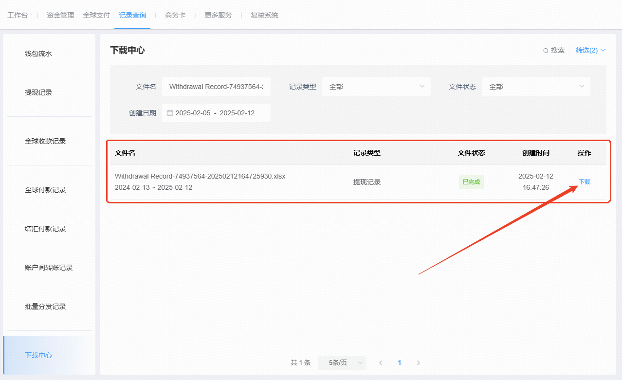 提现中仅包含提现操作下的账号交易情况和流水记录查看提现记录点击【记录查询】—【提现记录】。下载提现记录通过筛选选择对应的记录,之后点击右上角的【下载】。确认日期范围无误后点击【确认下载】。在下载中心中下载对应记录下载提现记录凭证您只能下载通过审核的交易凭证如需下载单条提现记录凭证,点击对应交易右侧的【出账凭证】。点击【下载凭证】。