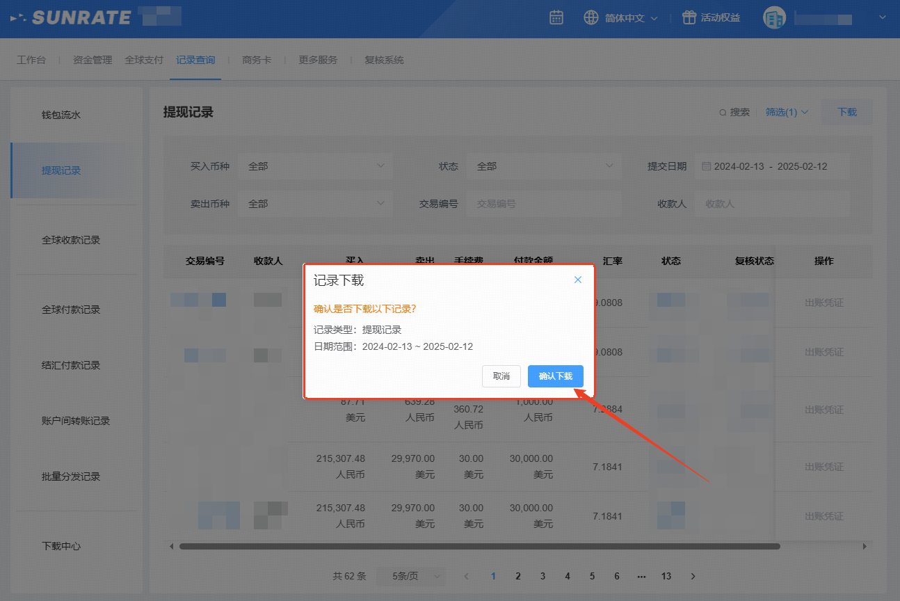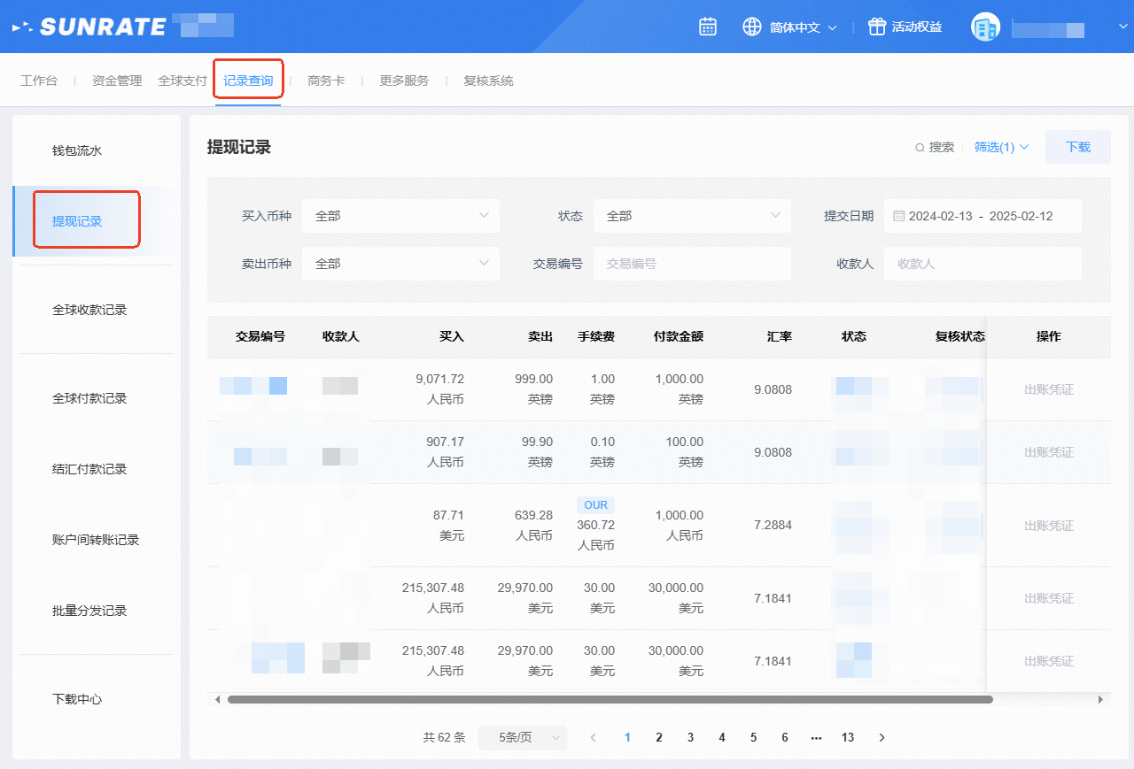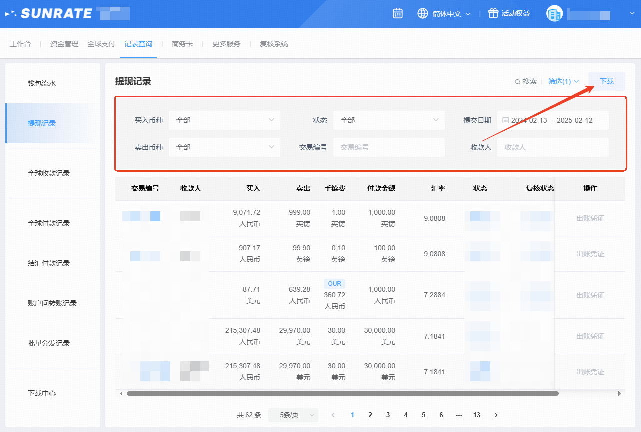 提现中仅包含提现操作下的账号交易情况和流水记录查看提现记录点击【记录查询】—【提现记录】。下载提现记录通过筛选选择对应的记录,之后点击右上角的【下载】。确认日期范围无误后点击【确认下载】。在下载中心中下载对应记录下载提现记录凭证您只能下载通过审核的交易凭证如需下载单条提现记录凭证,点击对应交易右侧的【出账凭证】。点击【下载凭证】。
