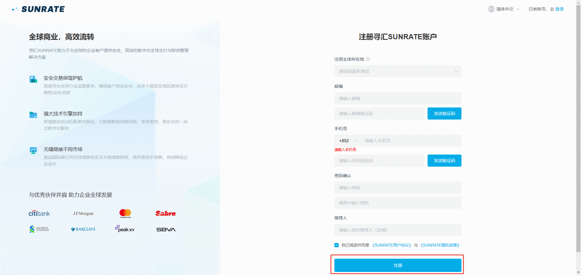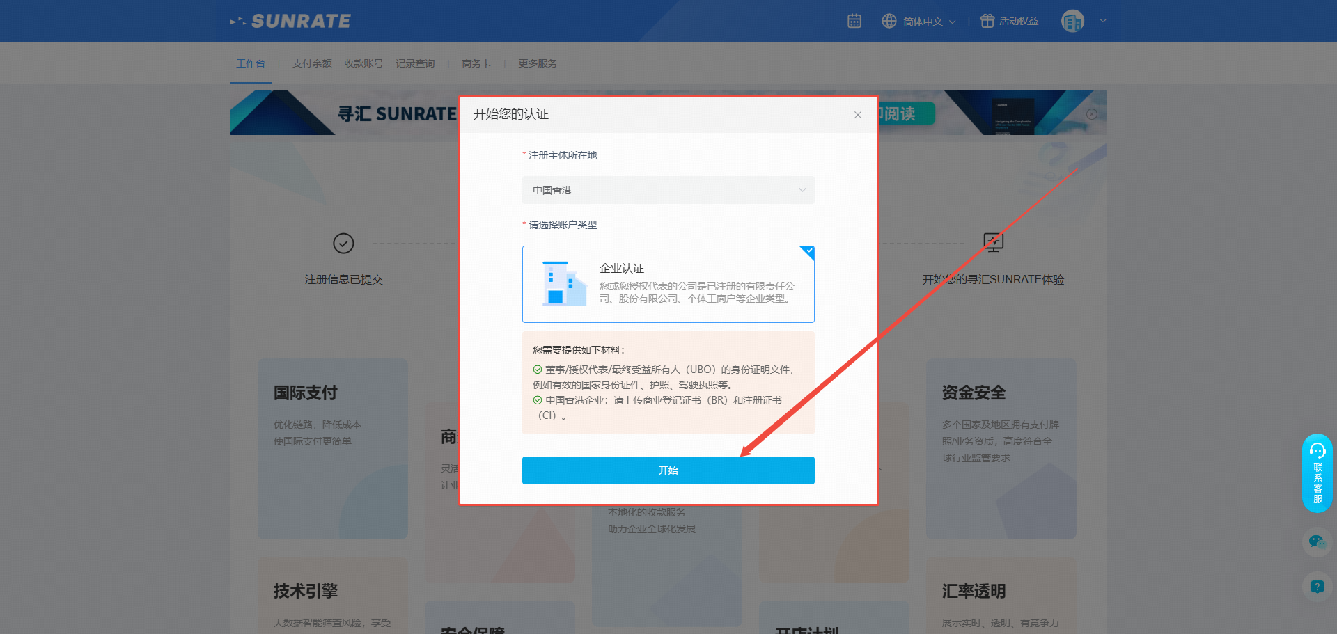 寻汇SUNRATE账户注册选择对应的【注册主体所在地】,输入您将来用于登录的邮箱和手机号,并完成验证码填写。*如您长时间未收到邮件验证码,请检查您的邮件垃圾箱;如有更多问题请联系我们获取帮助。输入您将来用于登录的密码,确认密码后点击【注册】。在跳转界面点击【开始】,进入企业认证(后续步骤请阅读<企业认证>)。